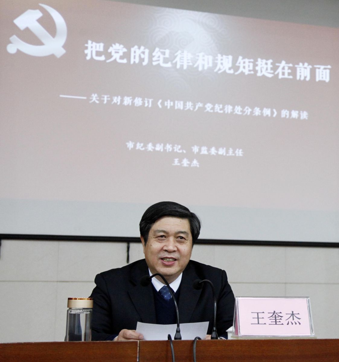 課上,王奎杰結(jié)合實際案例,以圖文并茂的形式,從修訂《條例》的重大意義、修改了哪些內(nèi)容、領(lǐng)導(dǎo)干部如何貫徹執(zhí)行好等三個方面,對《中國共產(chǎn)黨紀律處分條例》行了全面闡釋。并著重就如何把握《條例》的總則和違反政治紀律、組織紀律、廉潔紀律、群眾紀律、工作紀律、生活紀律的重點問題作了詳細講解。