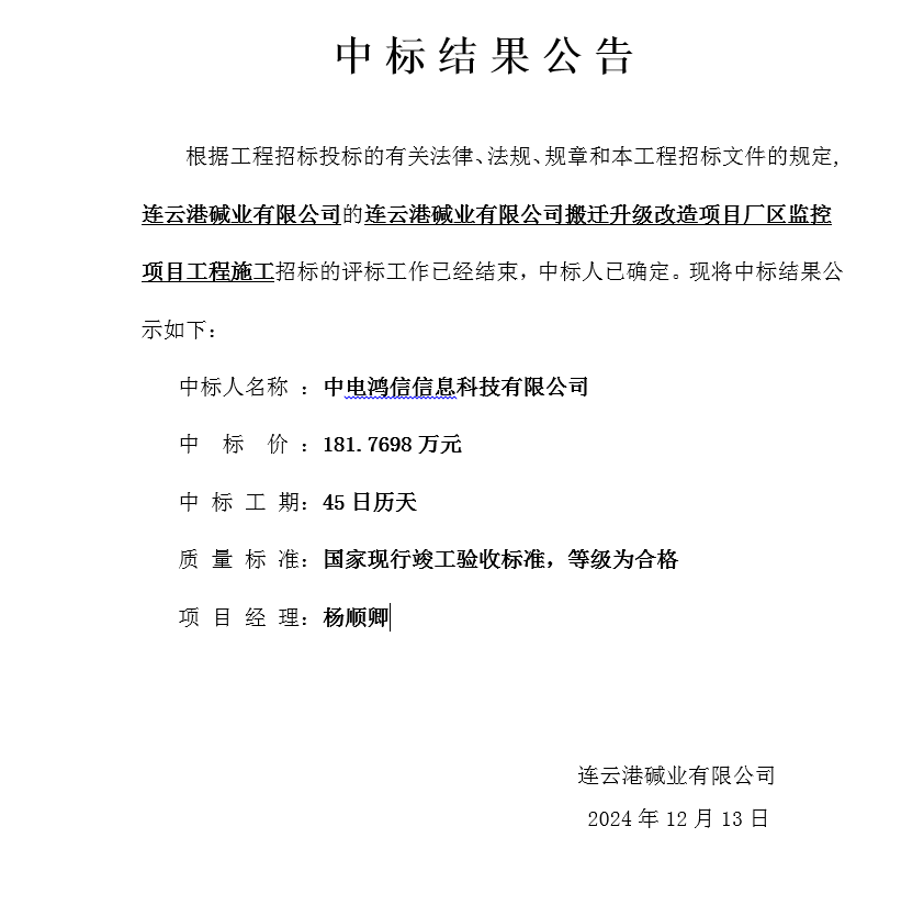 連云港堿業有限公司搬遷升級改造項目廠區監控項目工程施工中標結果公告