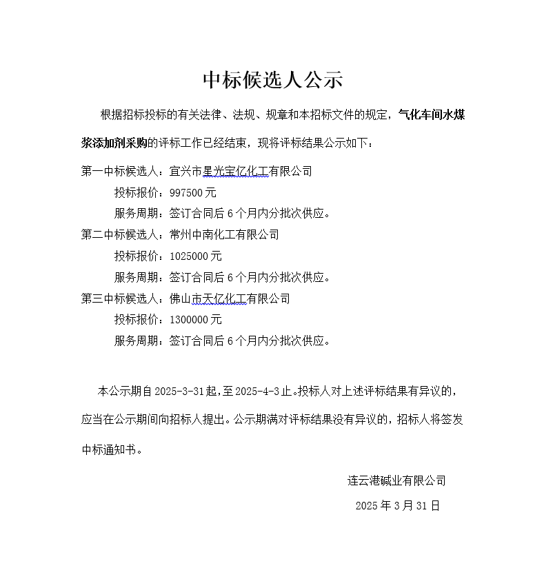 氣化車間水煤漿添加劑采購中標(biāo)候選人公示